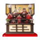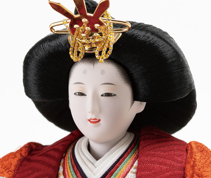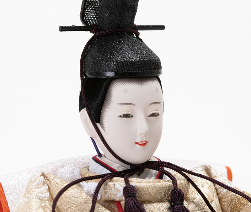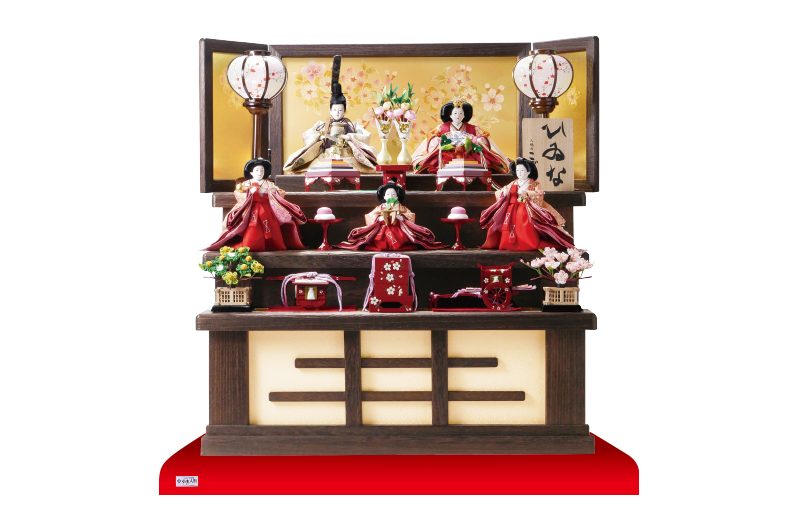 有職文様の本仕立てのお殿様・お姫様を、焼桐の飾り台に合わせた収納タイプの三段飾りです。