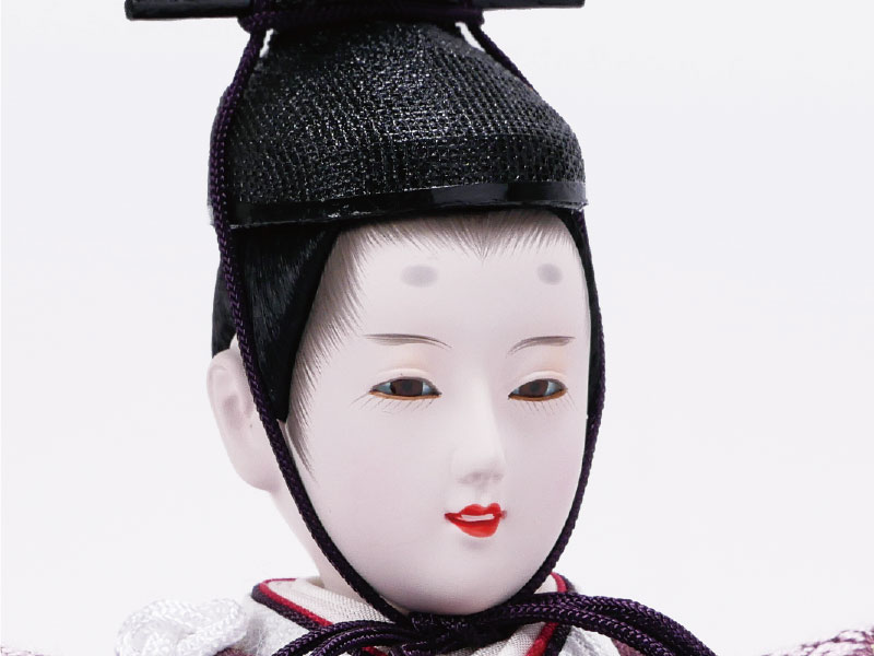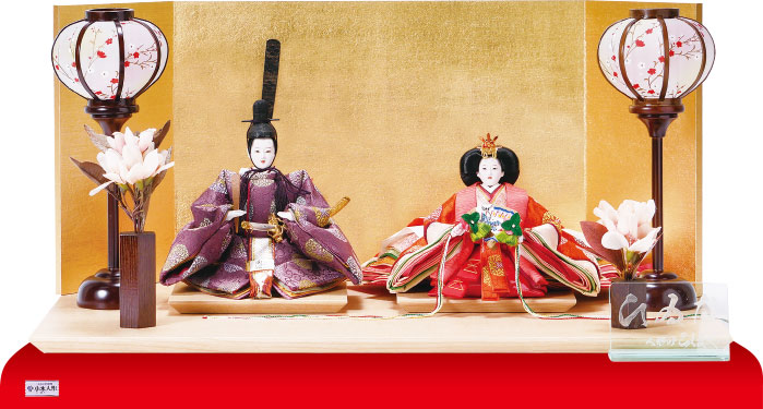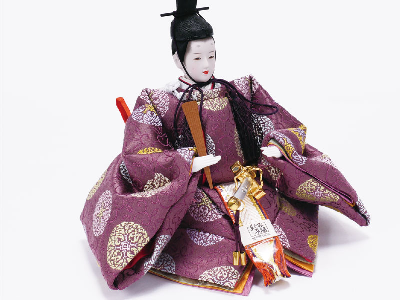 気品ある紫の有職文様の衣裳に、金屏風を合わせた、上品で優雅な親王飾りです。
