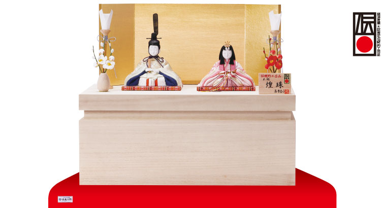 丸みを帯びたやさしいフォルムに上品な衣裳のお雛様。シンプルな金屏風と組み合わせた、コンパクトサイズの収納飾りです。