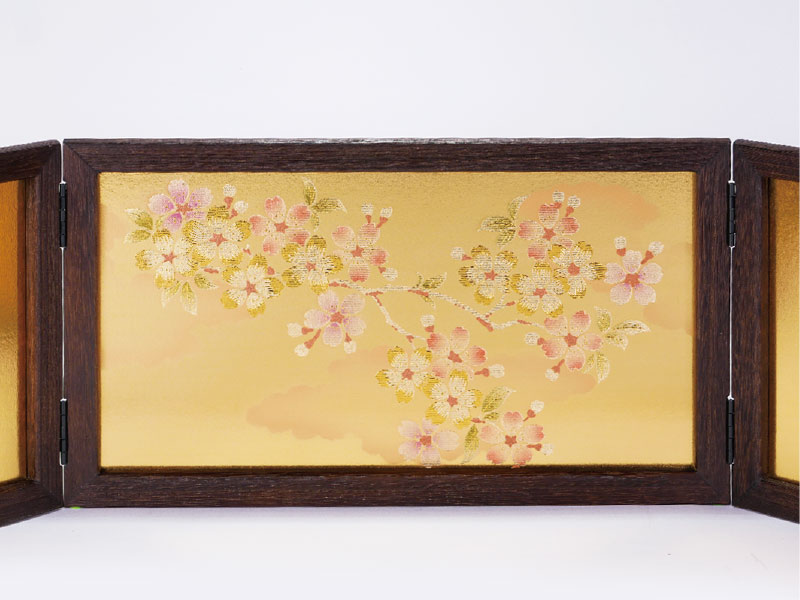 焼桐枠の金屏風に桜の花を施し可愛らしく仕上げました