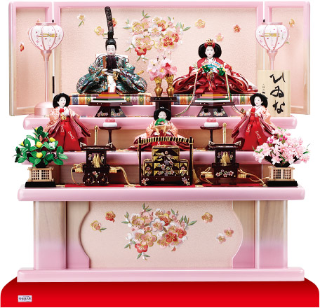 ピンクの可愛らしい飾り台と花柄屏風を組み合わせ、明るく華やかに仕上げた三段飾りです。