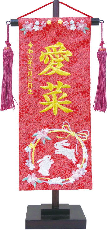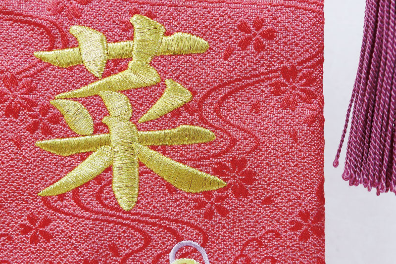 お子様のお名前と生年月日は、ピンク地に映える金色の刺繍で入ります。