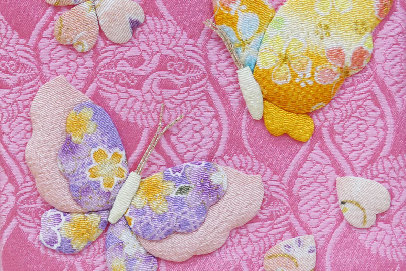 ちりめんで作られた、ふっくらとした立体感のある花と蝶の飾りがとても可愛い名前旗です。