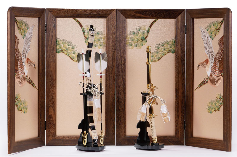 伊保田蝋仕上げの焼桐屏風には「鷹と松」の刺繍を施し、弓太刀は木製高級品を使用。