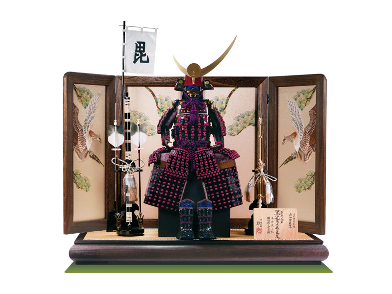 前立てに「日月」を付け、焼桐台に松鷹の刺繍が付いた焼桐屏風、幟旗、弓太刀と