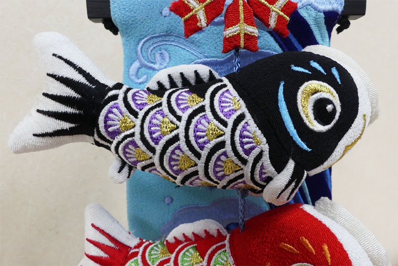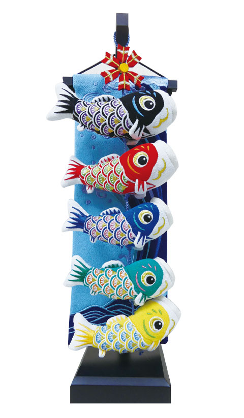 静海波文様をあしらった黒・赤・青・緑・黄の鯉飾り。