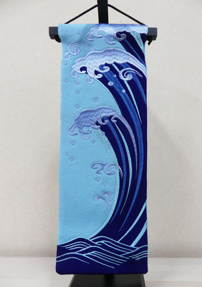 大波の絵柄が描かれた旗に鯉が力強く登る姿は、