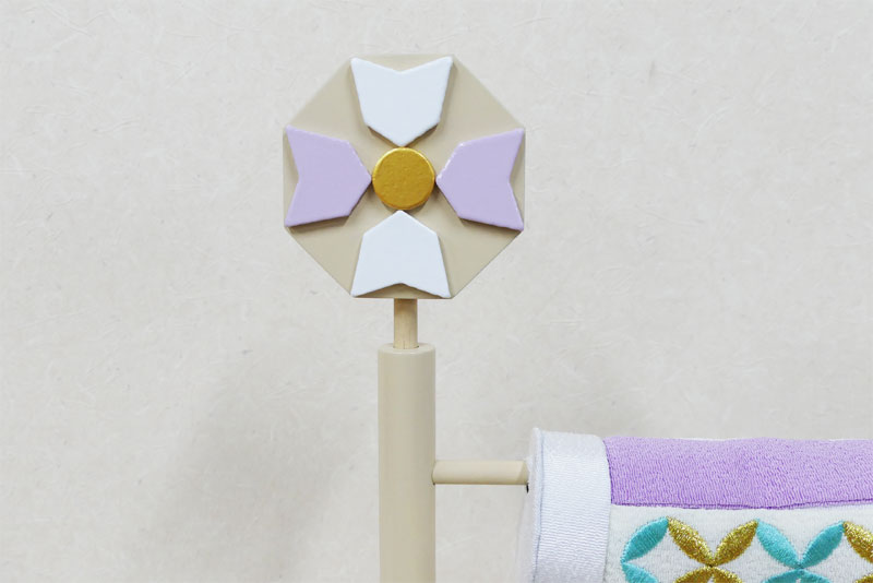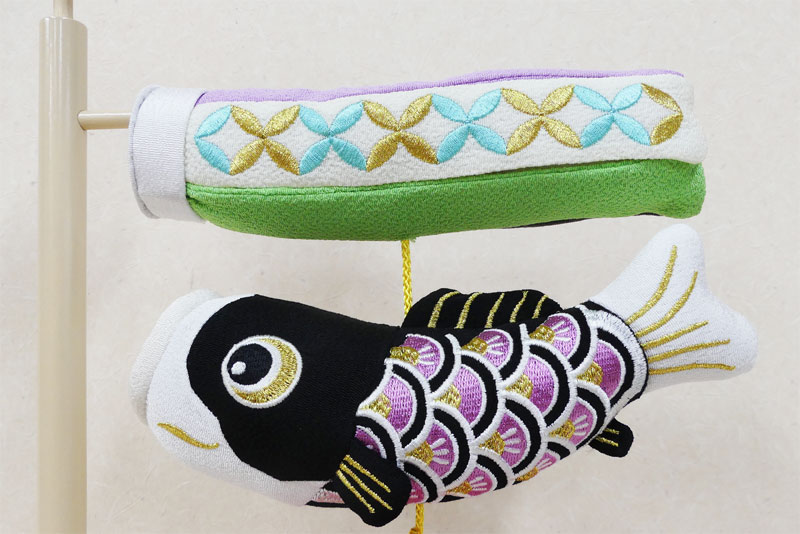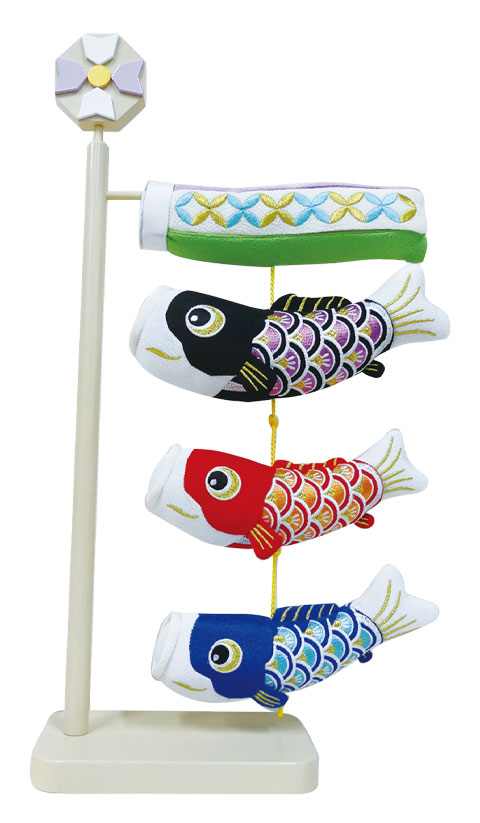 鯉のぼりを連想させる飾り台に、七宝柄の吹き流しと黒・赤・青の