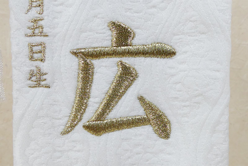 お子様のお名前と生年月日は、白地に映える金色の刺繍で入ります。